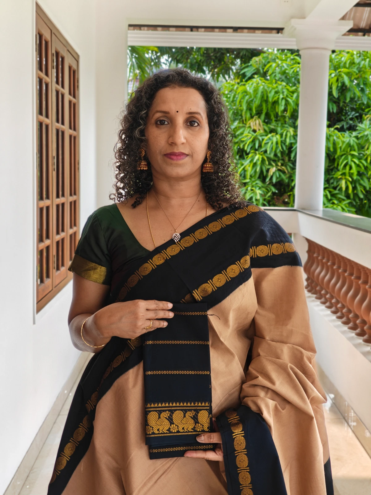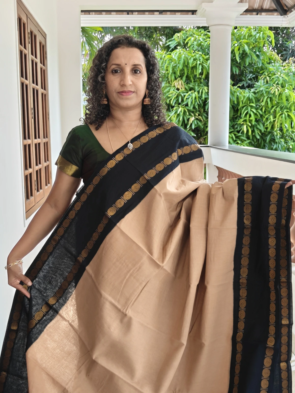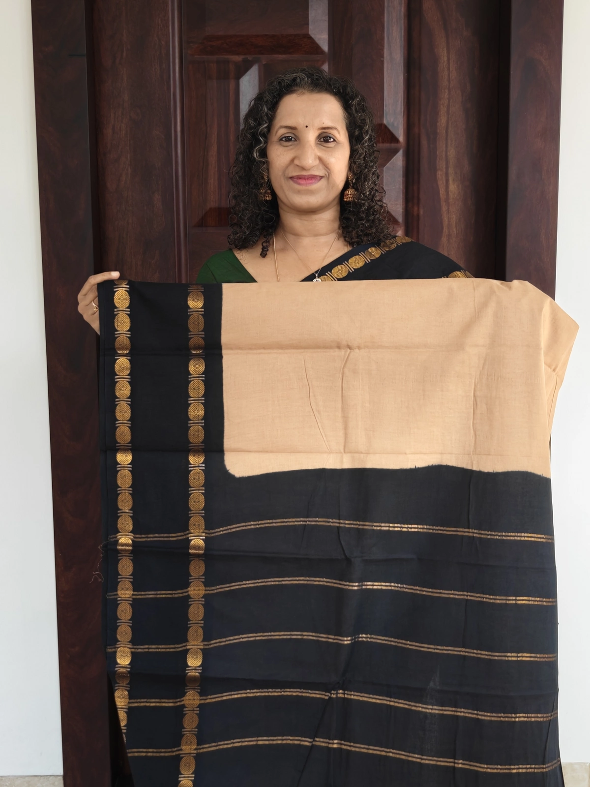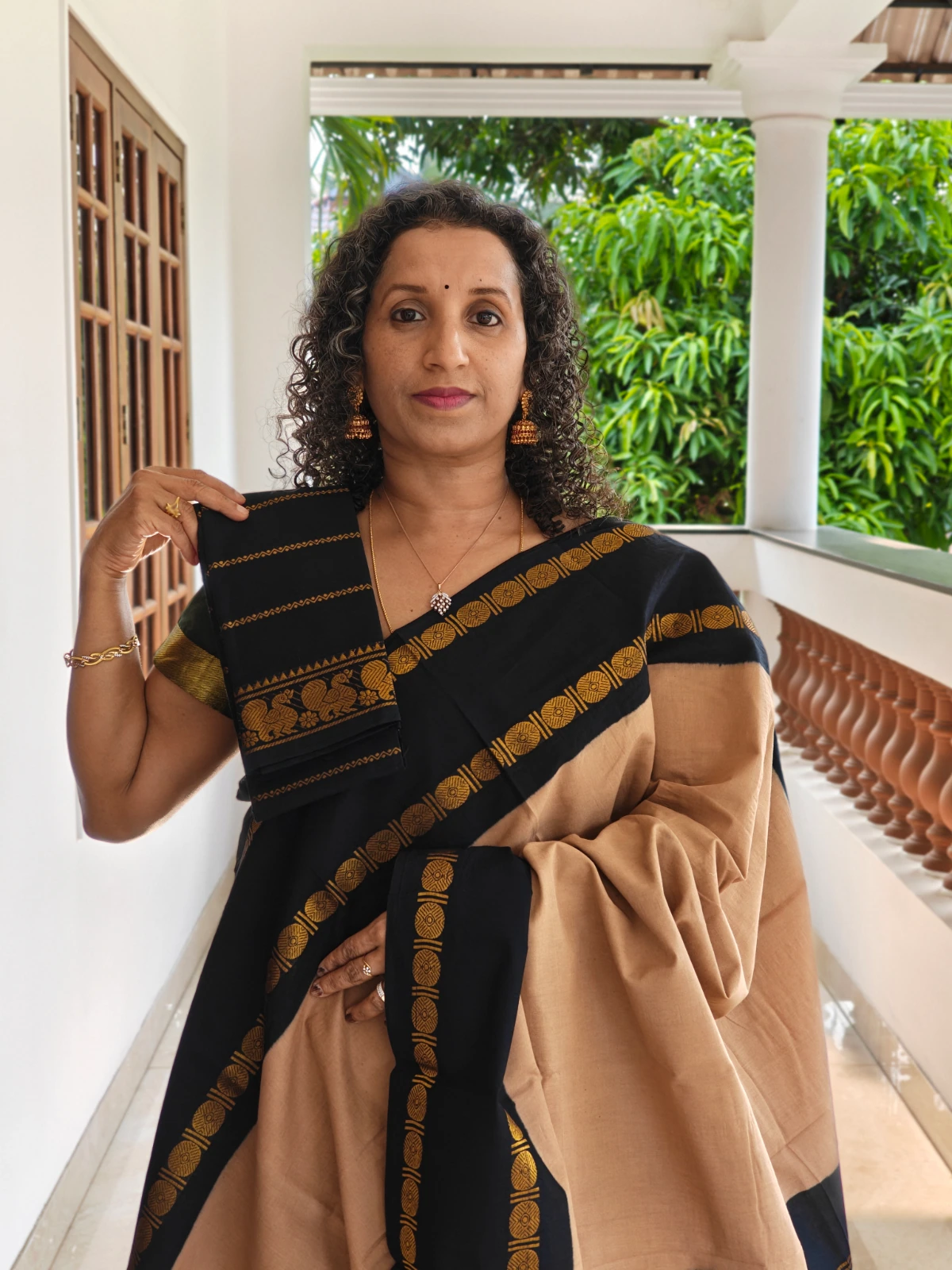 This saree features a beige base highlighted with gold Zari Rudrasham border in black color, creating a sophisticated pattern that adds subtle shine and texture. The saree is complemented by a black blouse piece with a Zari Peacock border, giving it a refined ethnic finish.