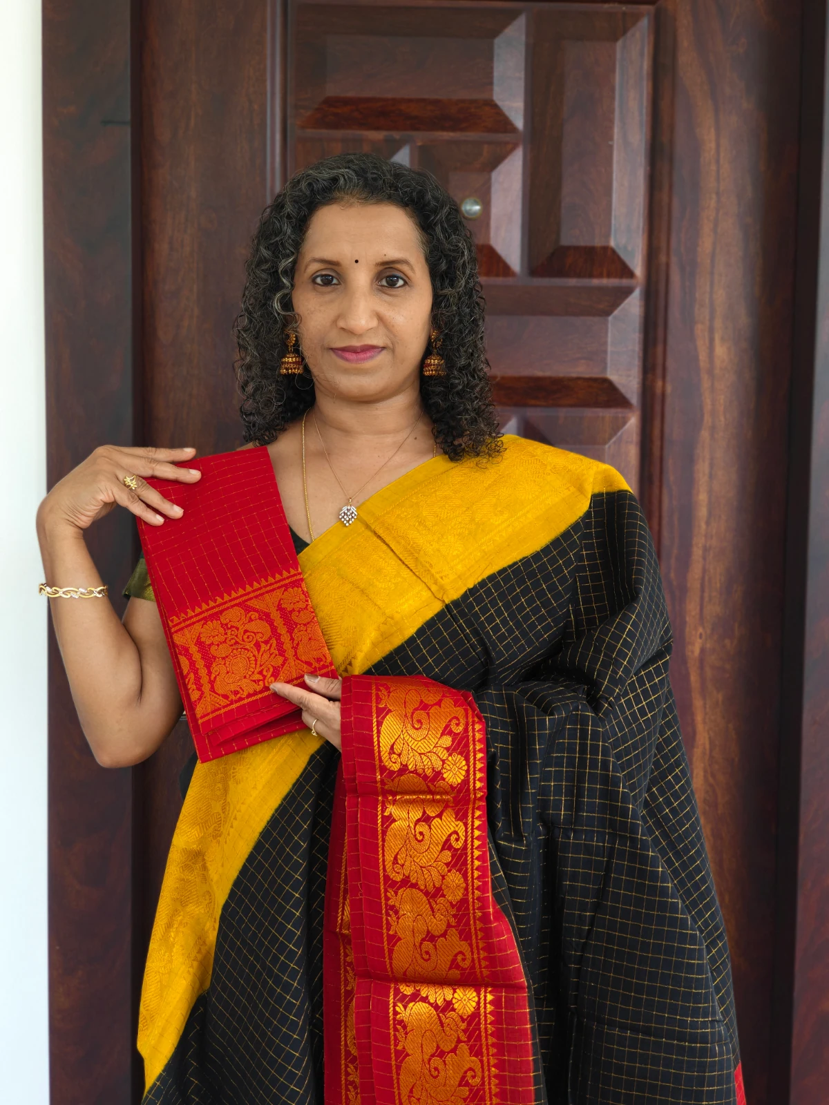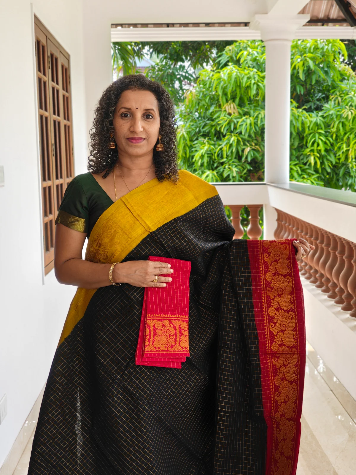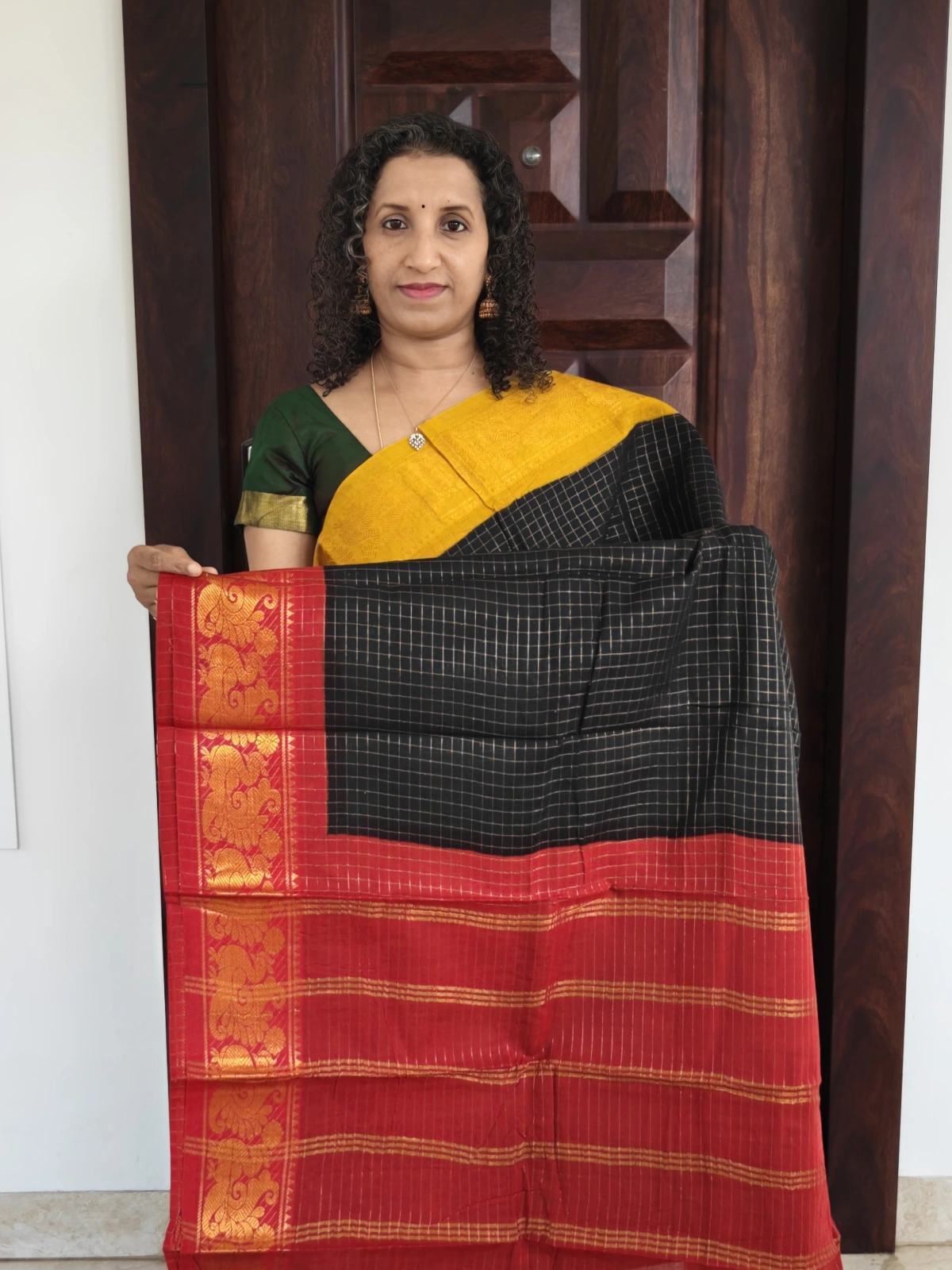 Experience the charm of traditional South Indian weaving with this Authentic Madurai Ganga Jamuna Sungudi Cotton Saree in classic black, beautifully designed with elegant small Zari kattam (check) patterns across the body. Sungudi sarees are a heritage textile from Madurai, celebrated for their lightweight comfort, breathable cotton fabric, and timeless appeal.