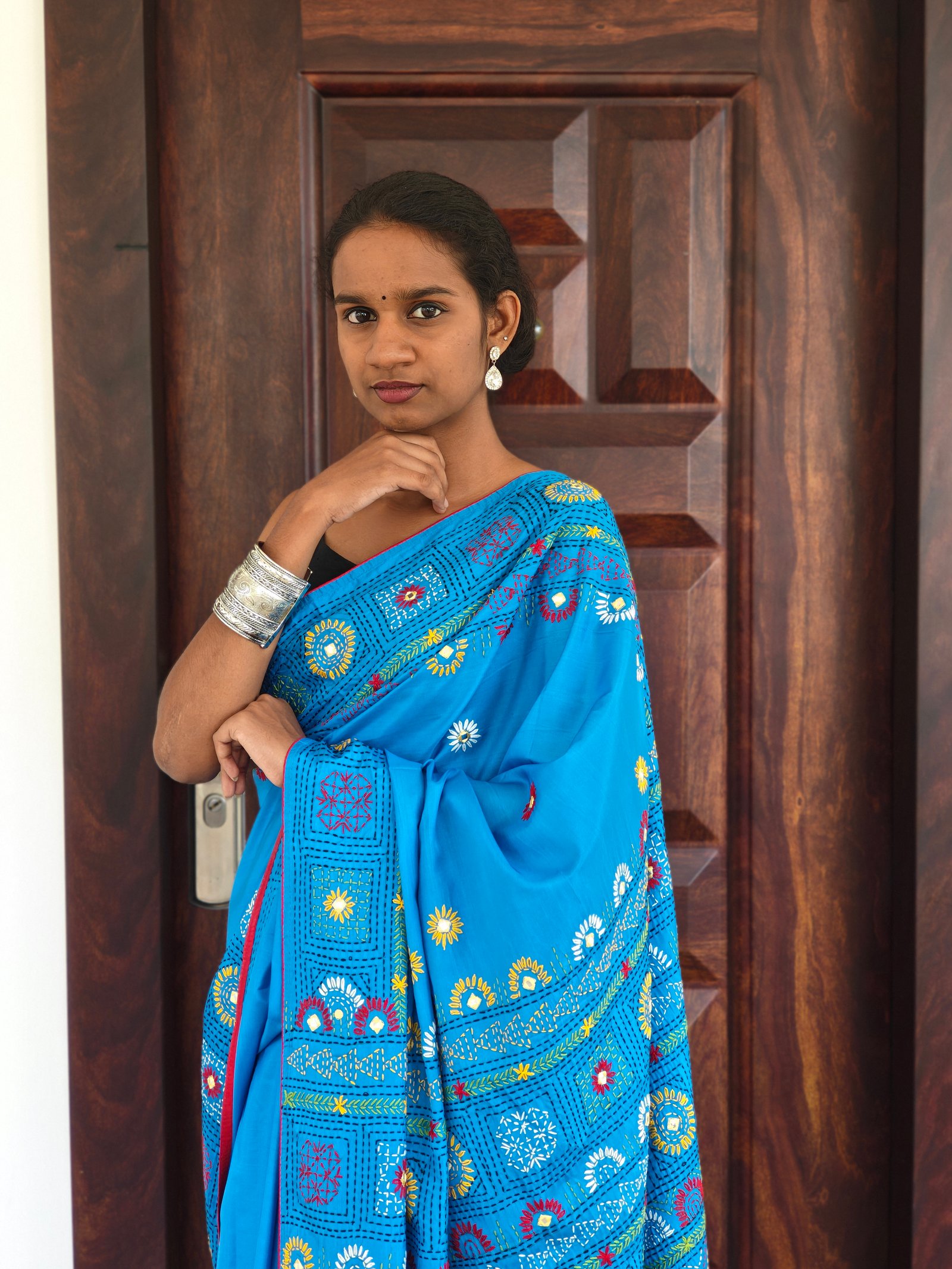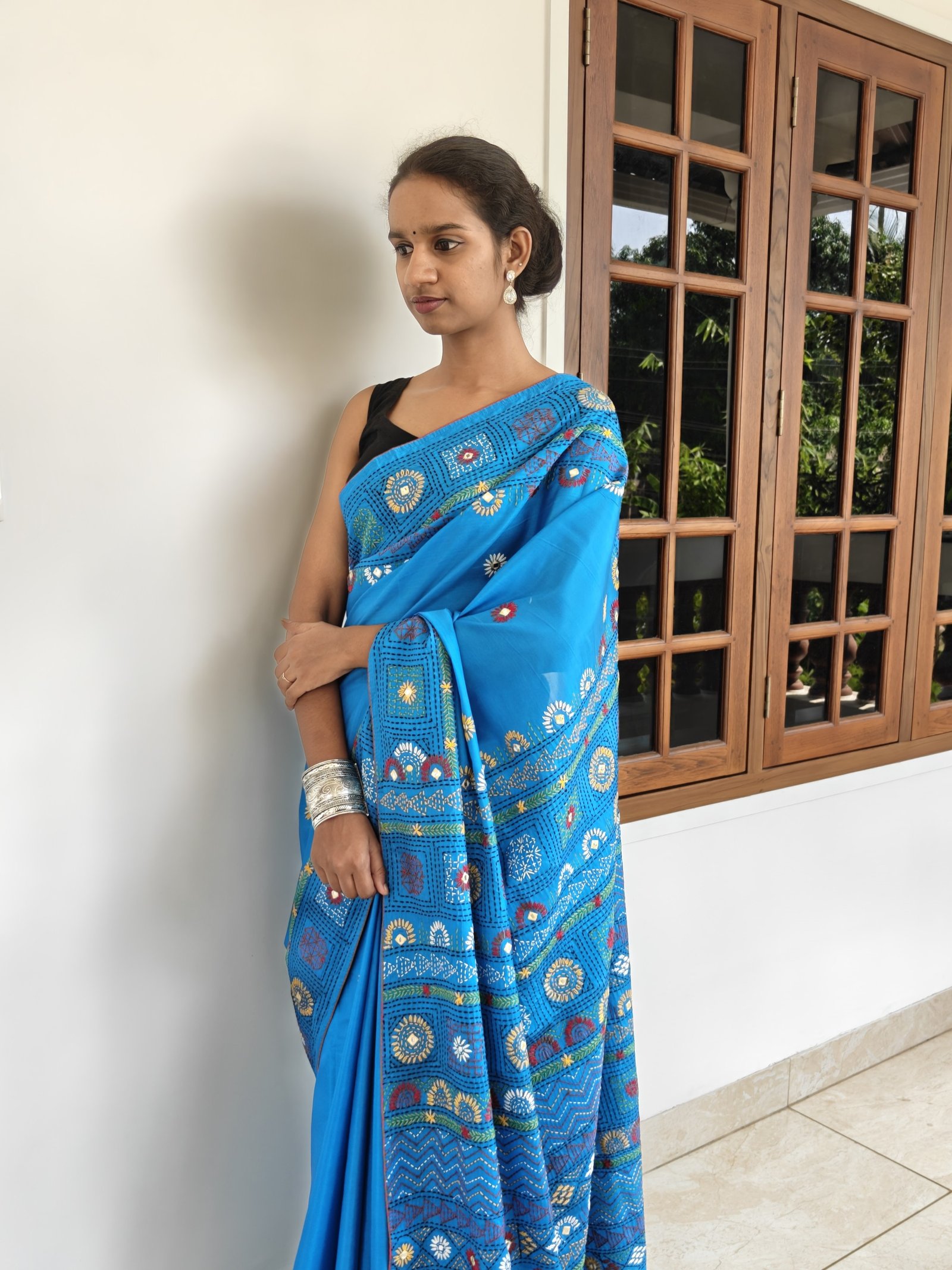 This saree showcases a bright blue base enhanced with multicolored embroidered motifs and decorative patterns across the pallu and border, creating a striking and artistic look. The detailed embroidery panels add depth and texture, making the saree visually unique and culturally rich.