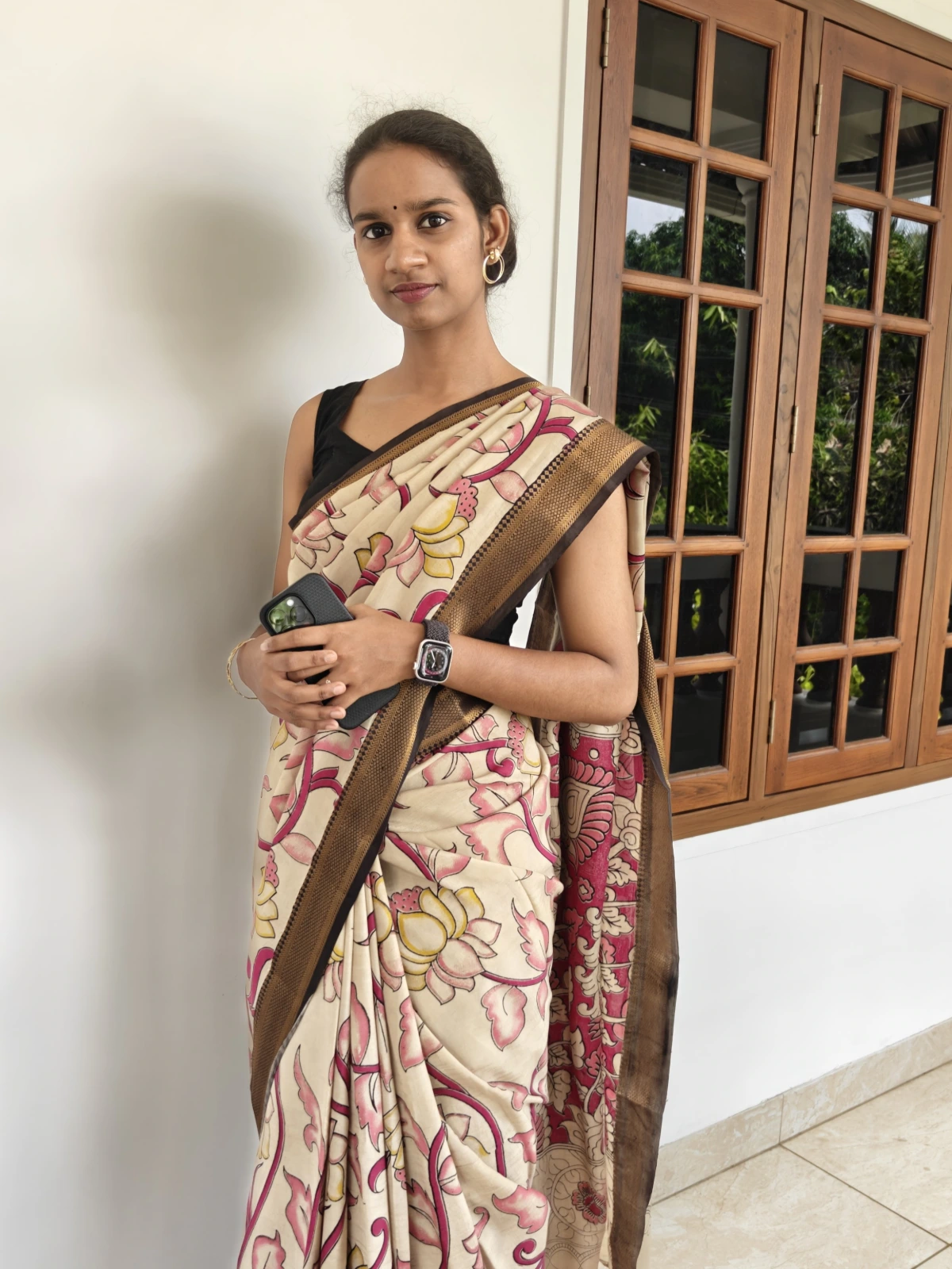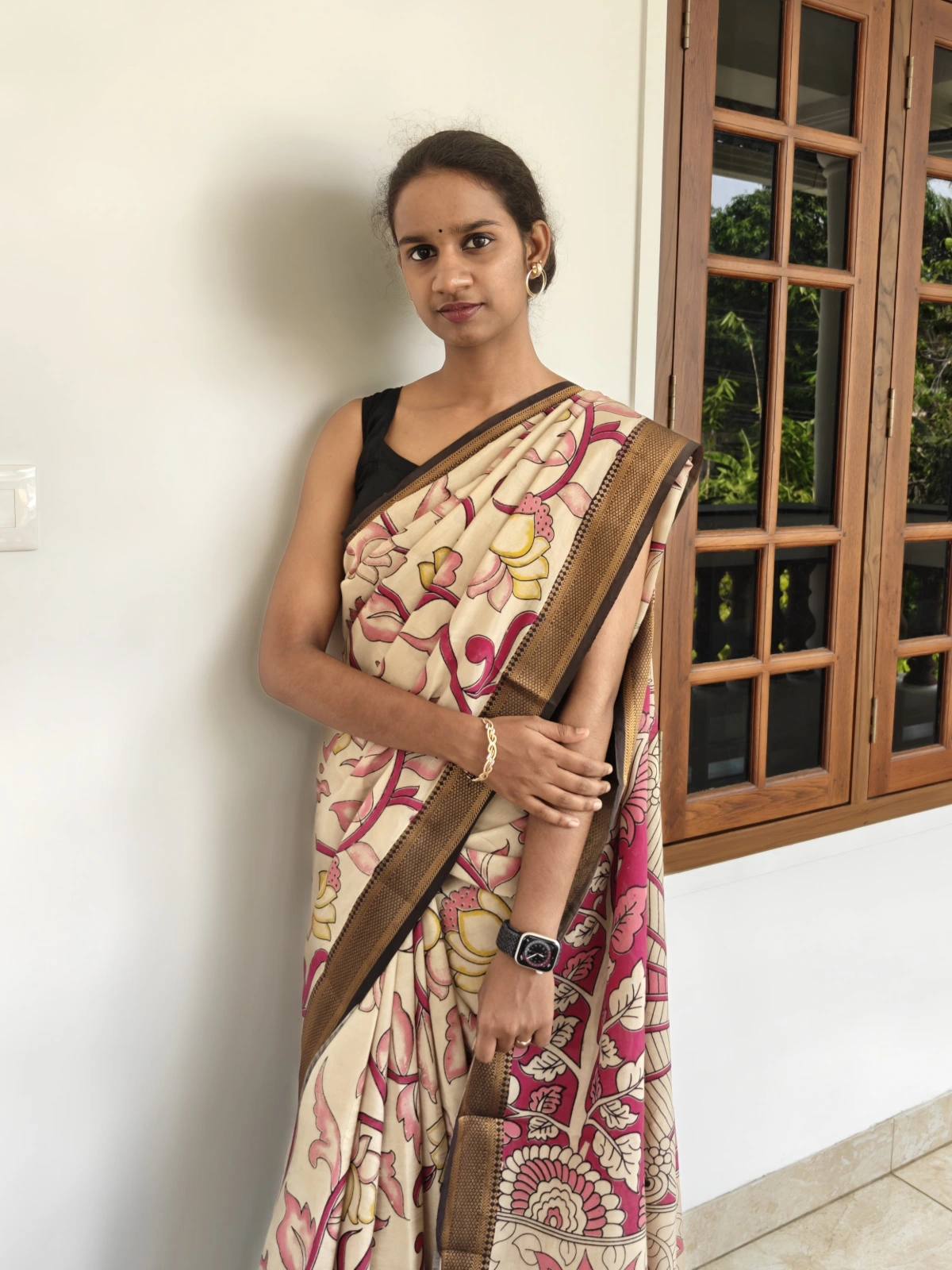 Style this Kalamkari saree with temple jewellery, antique gold, or oxidized silver pieces to highlight its traditional artistry. Opt for a low bun with jasmine flowers or soft waves for an elegant ethnic look. Complete the style with warm earthy makeup tones and maroon or nude lipstick, making it perfect for festivals, temple visits, and cultural gatherings.