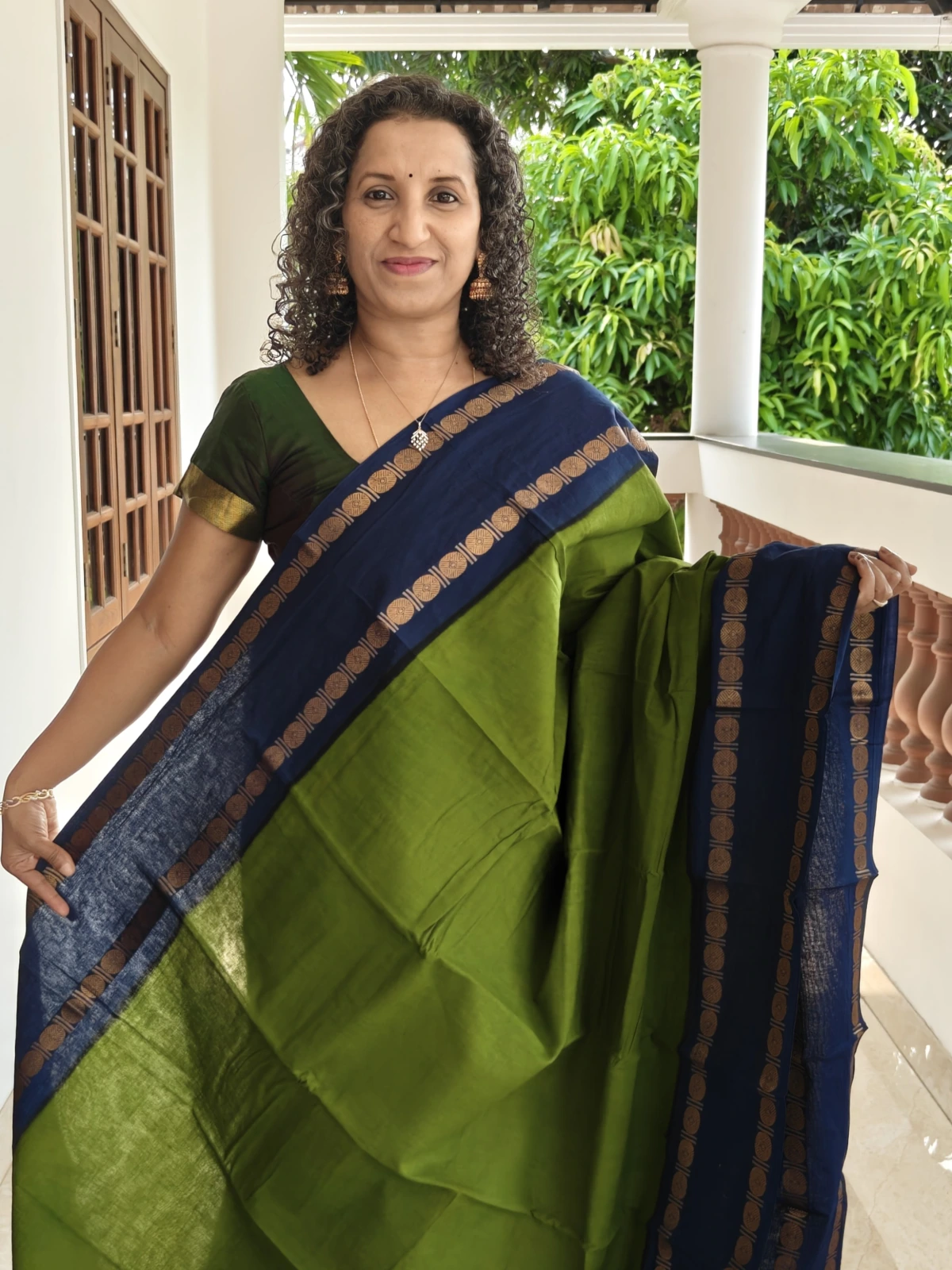 Experience the charm of traditional South Indian weaving with this Authentic Madurai Sungudi Cotton Saree in Green, beautifully designed with an elegant Rudrasham Zari gap border in Blue. Sungudi sarees are a heritage textile from Madurai, celebrated for their lightweight comfort, breathable cotton fabric, and timeless appeal.