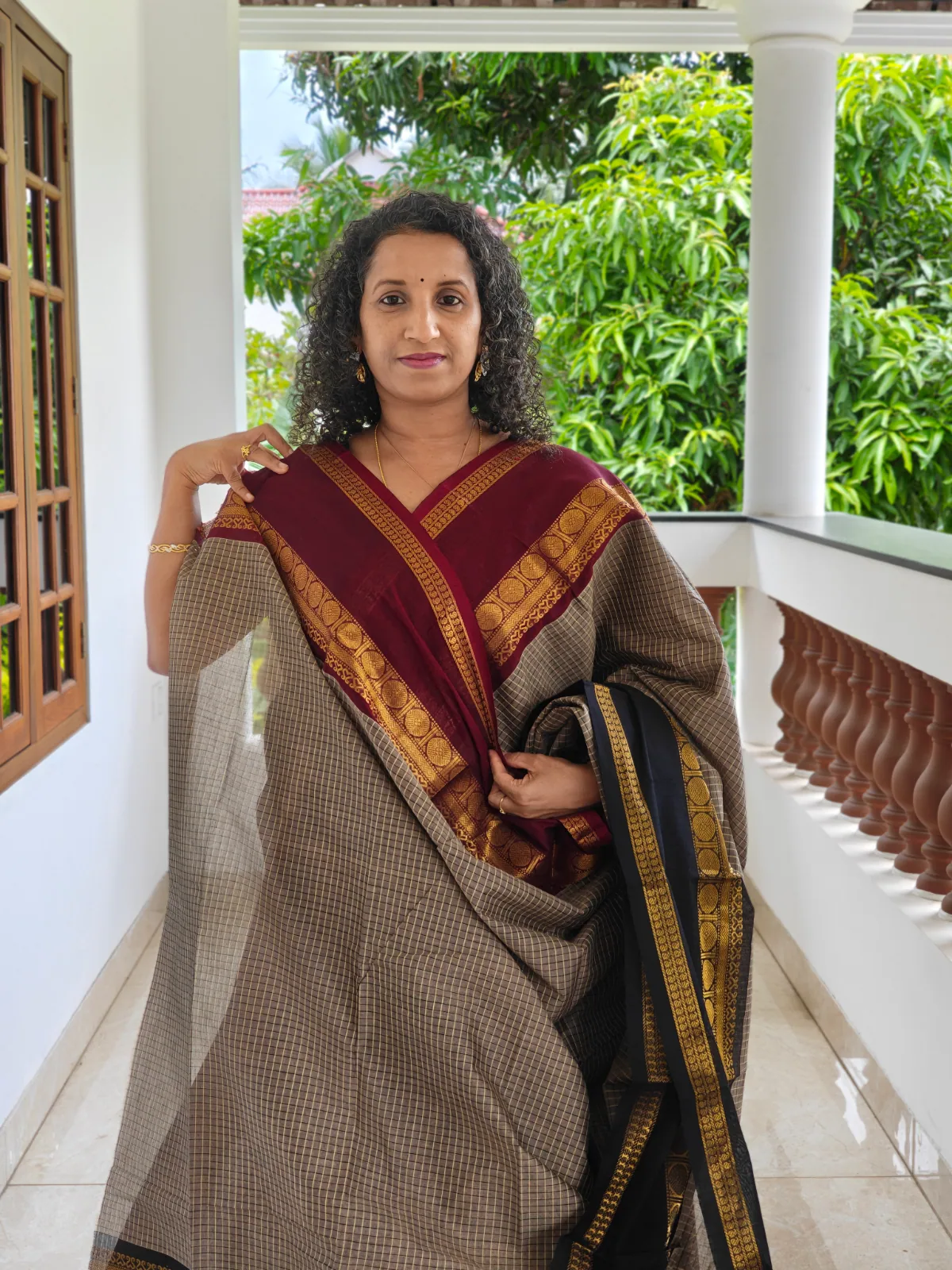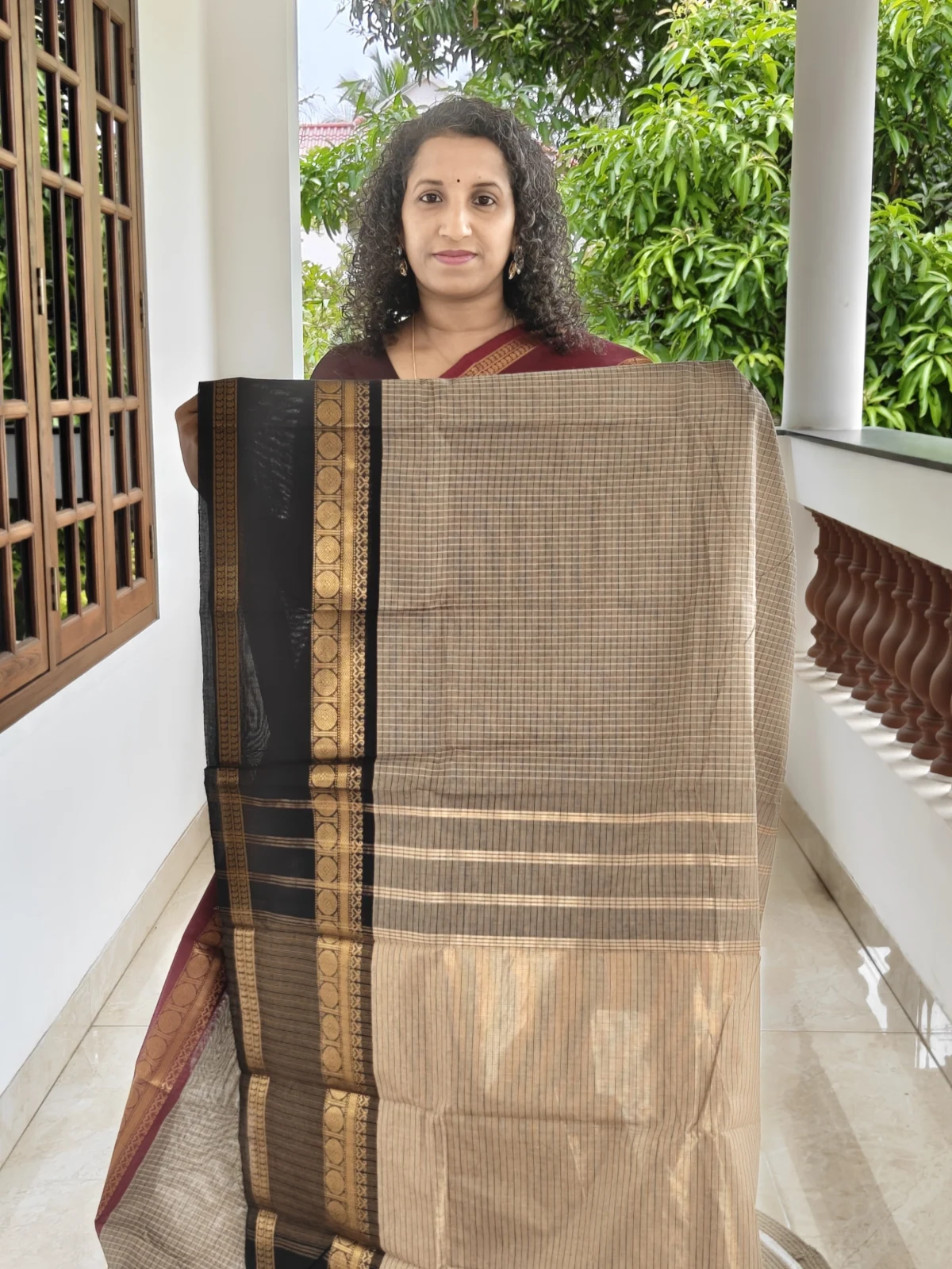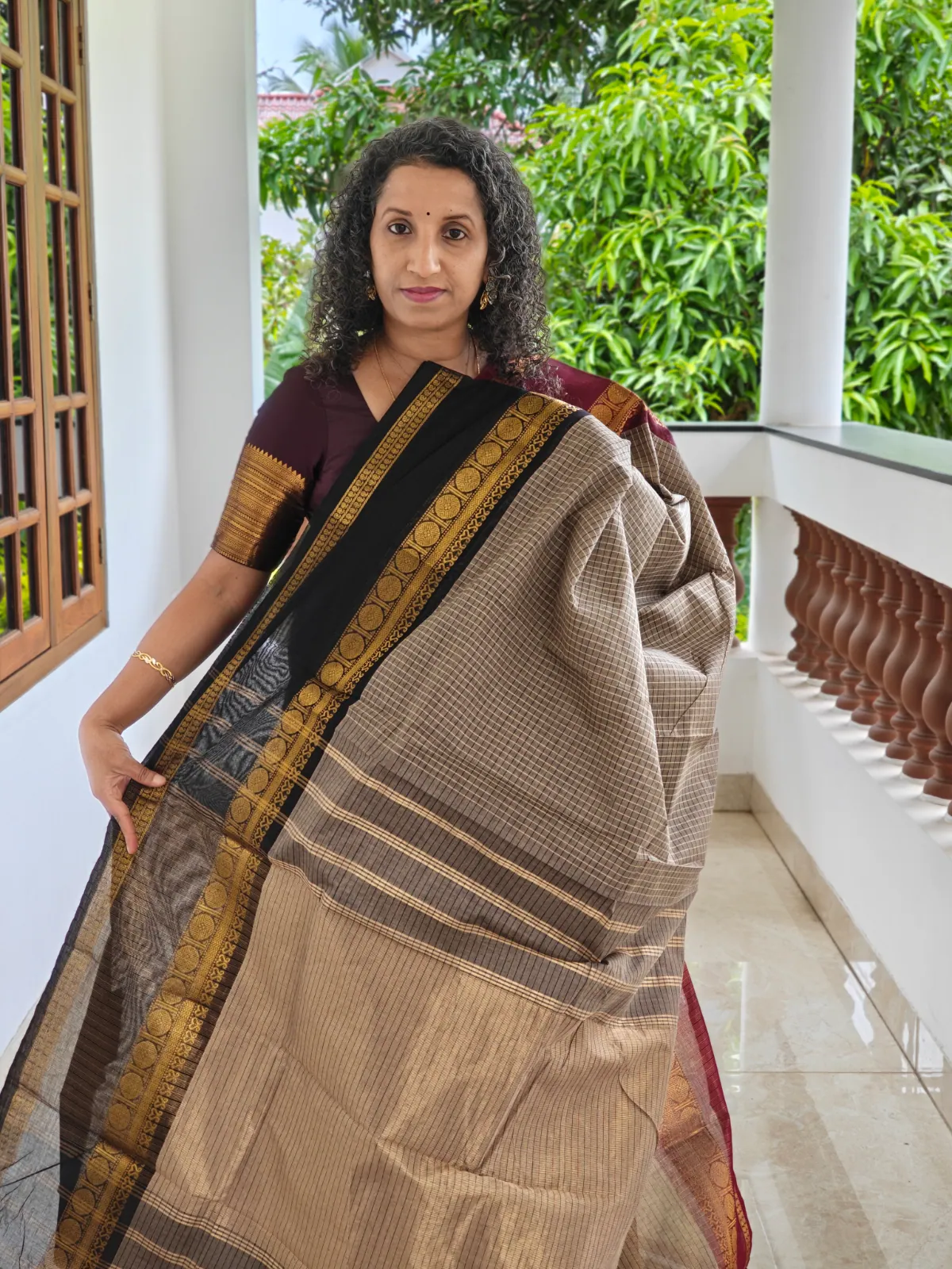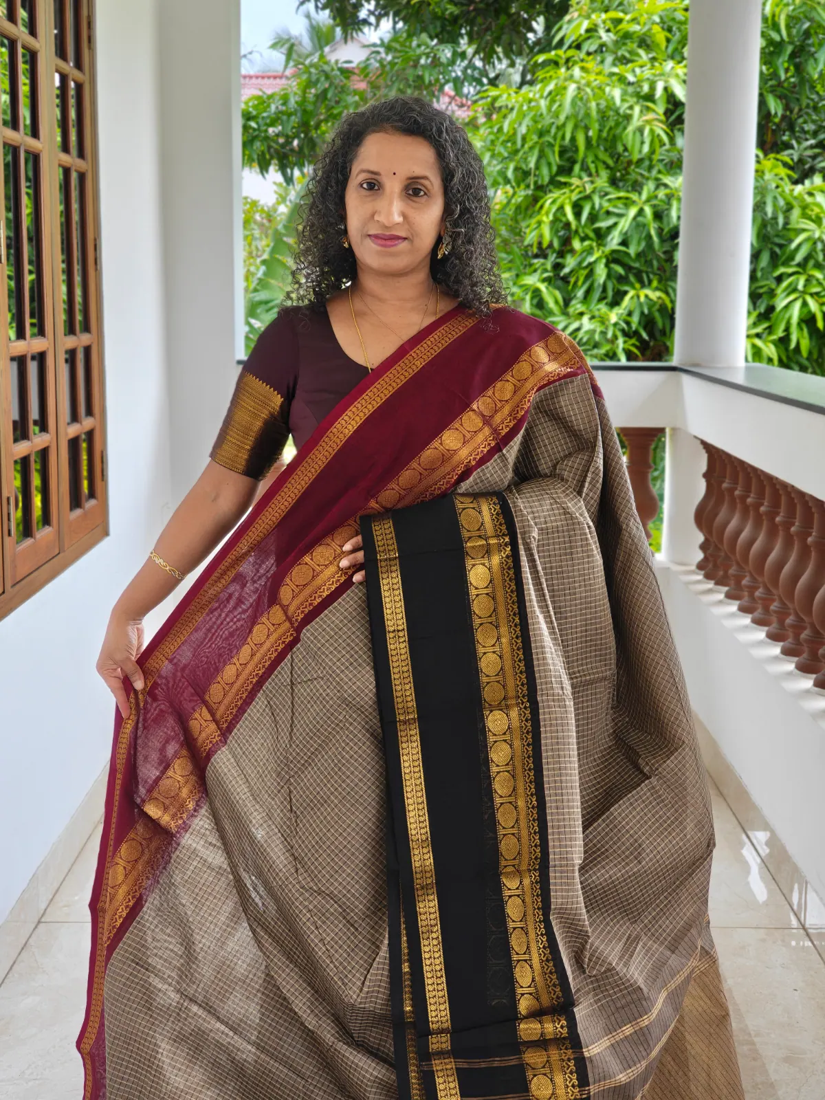 Add timeless elegance to your ethnic wardrobe with this Ganga Jamuna checks Maroon and Black Border Kanchi Cotton Saree, a perfect blend of traditional craftsmanship and everyday comfort. This saree showcases a refined and earthy color palette with a soft beige-grey body adorned in delicate, small checks that lend it a subtle, textured elegance. The highlight is its classic Ganga-Jamuna style border, one side in rich maroon with traditional gold zari motifs, and the other in deep black with intricate gold detailing, creating a striking dual contrast.