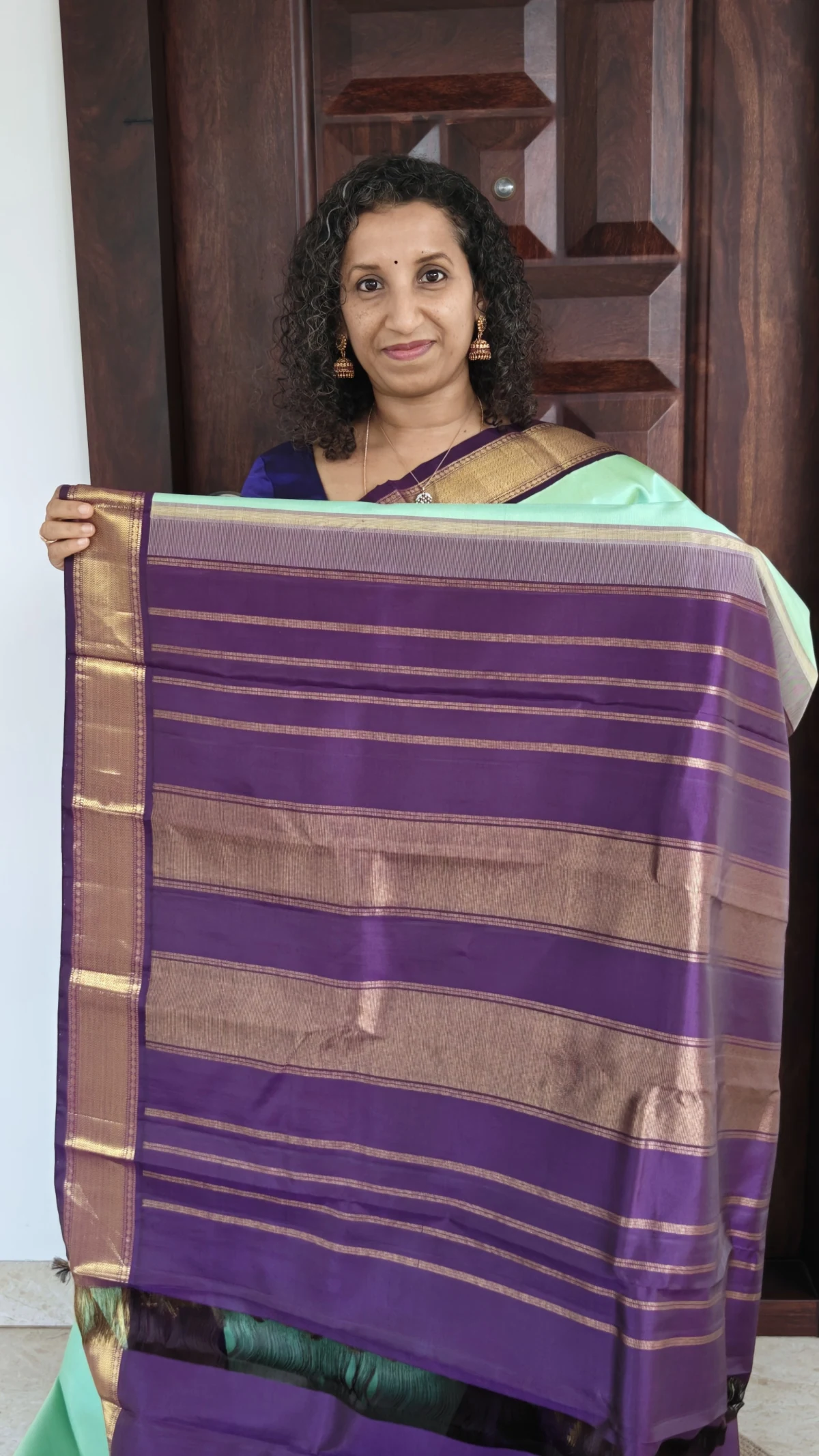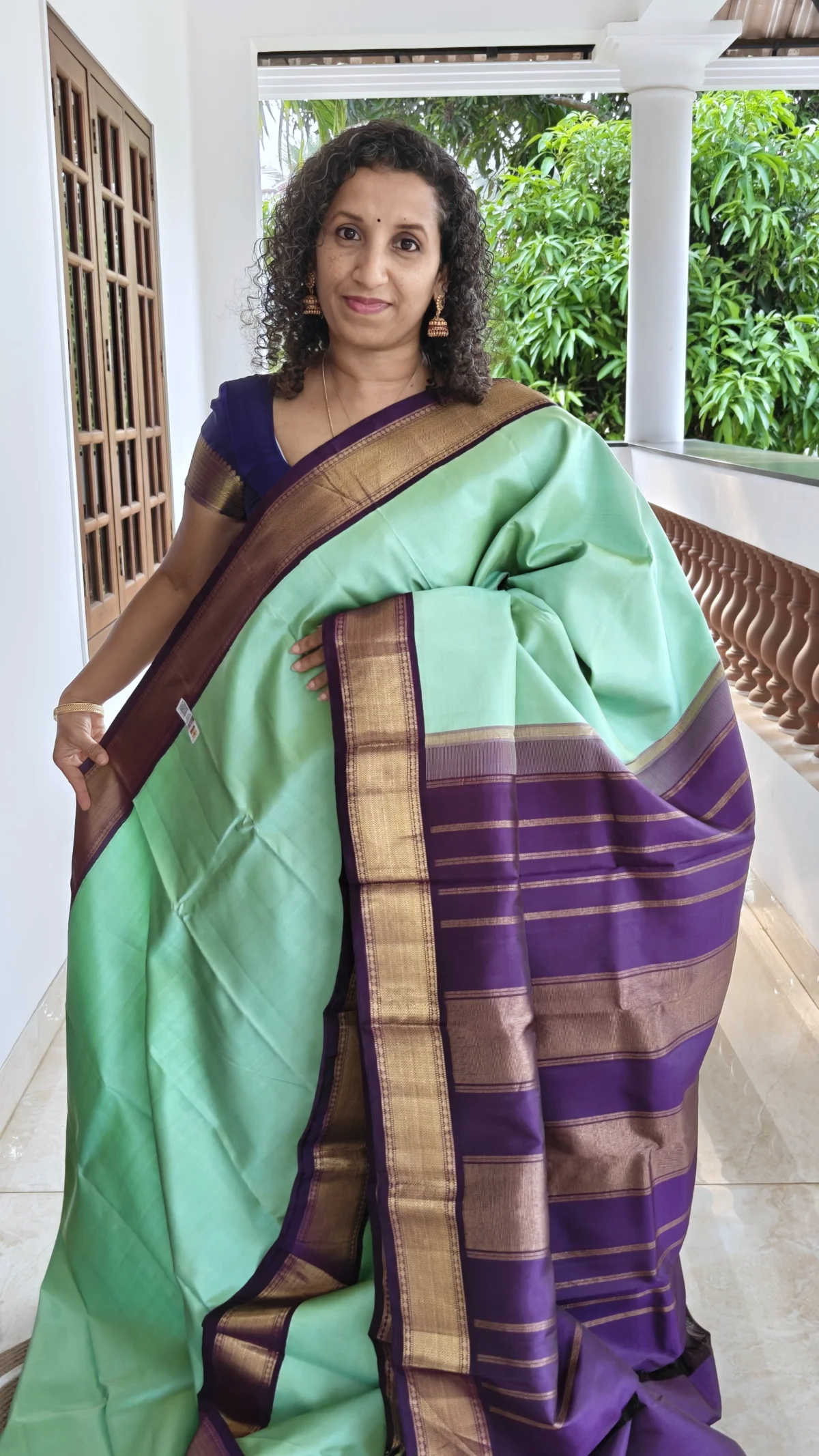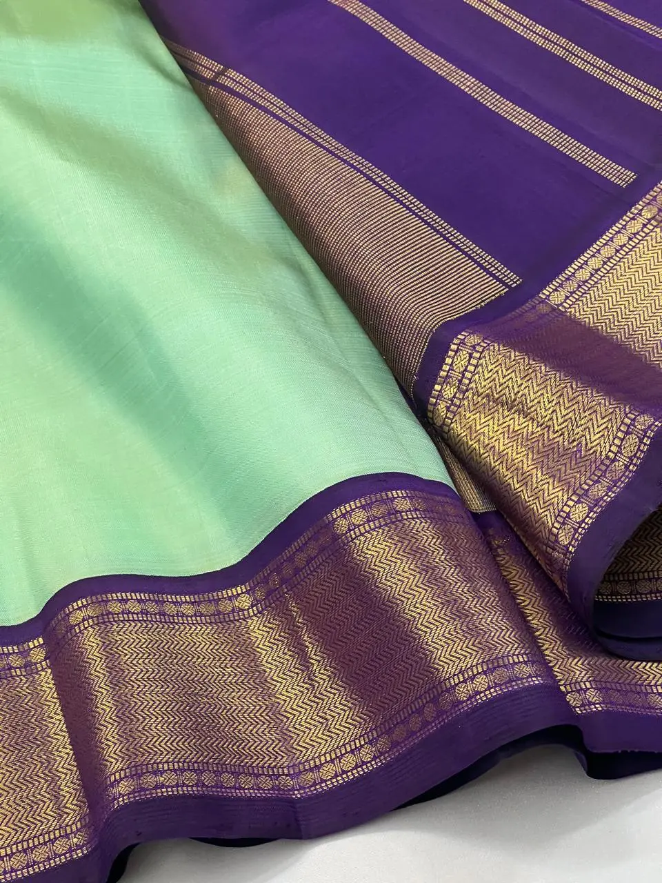 Celebrate timeless South Indian heritage with this Kanchipuram Korvai traditional pure silk saree, meticulously handwoven using Silk Mark–certified pure silk. The saree features a serene Mint green body beautifully contrasted with a rich violet Korvai border, woven separately and interlocked using the age-old Korvai technique—an authentic hallmark of Kanchipuram craftsmanship.