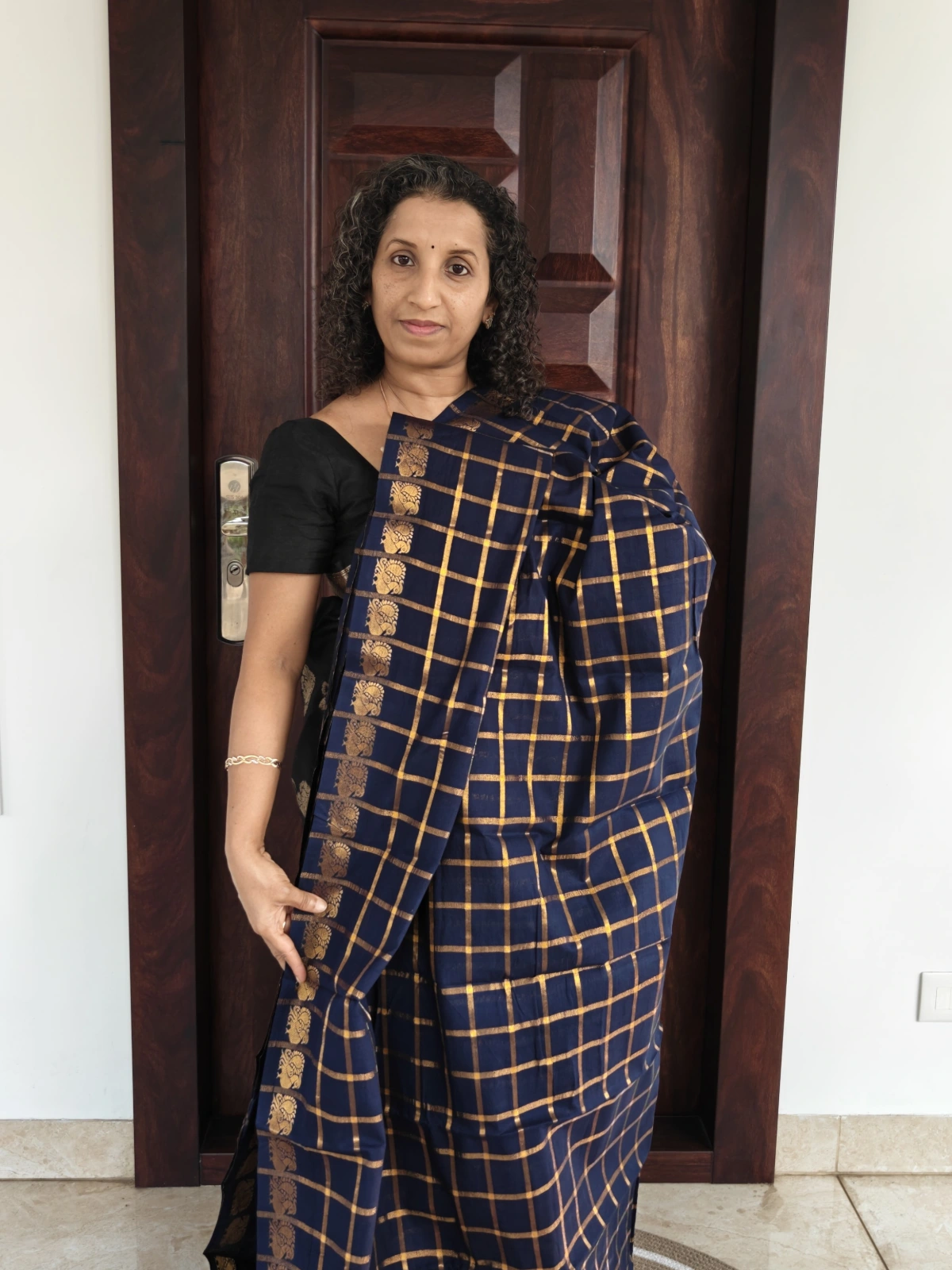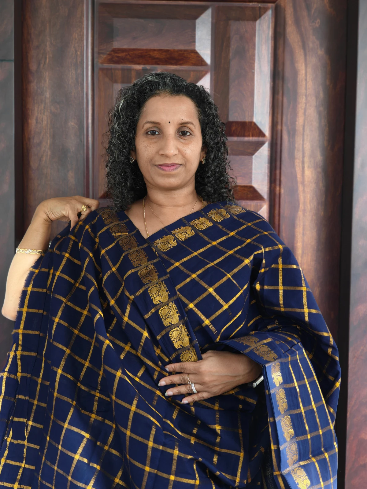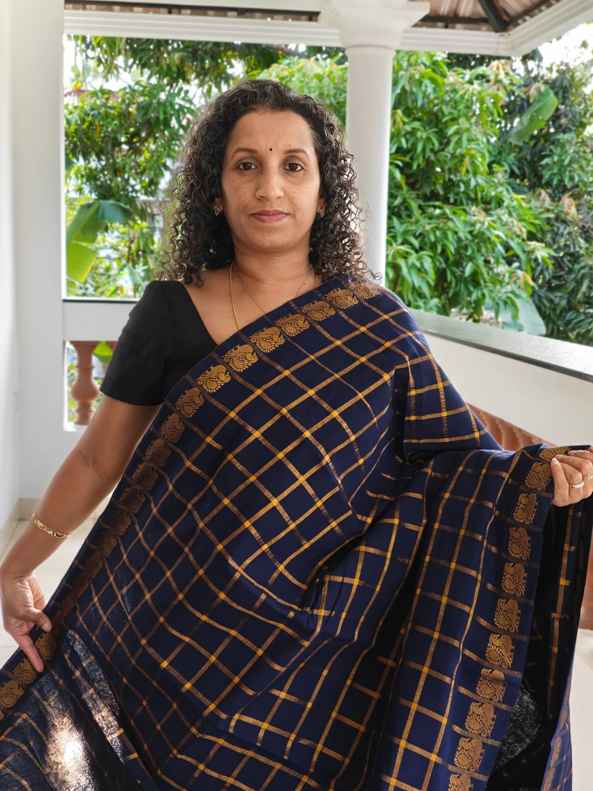 This saree features a rich navy blue base highlighted with golden Zari kattam checks, creating a sophisticated geometric pattern that adds subtle shine and texture. The saree is further enhanced with a traditional Zari border woven with classic motifs, giving it a refined ethnic finish.