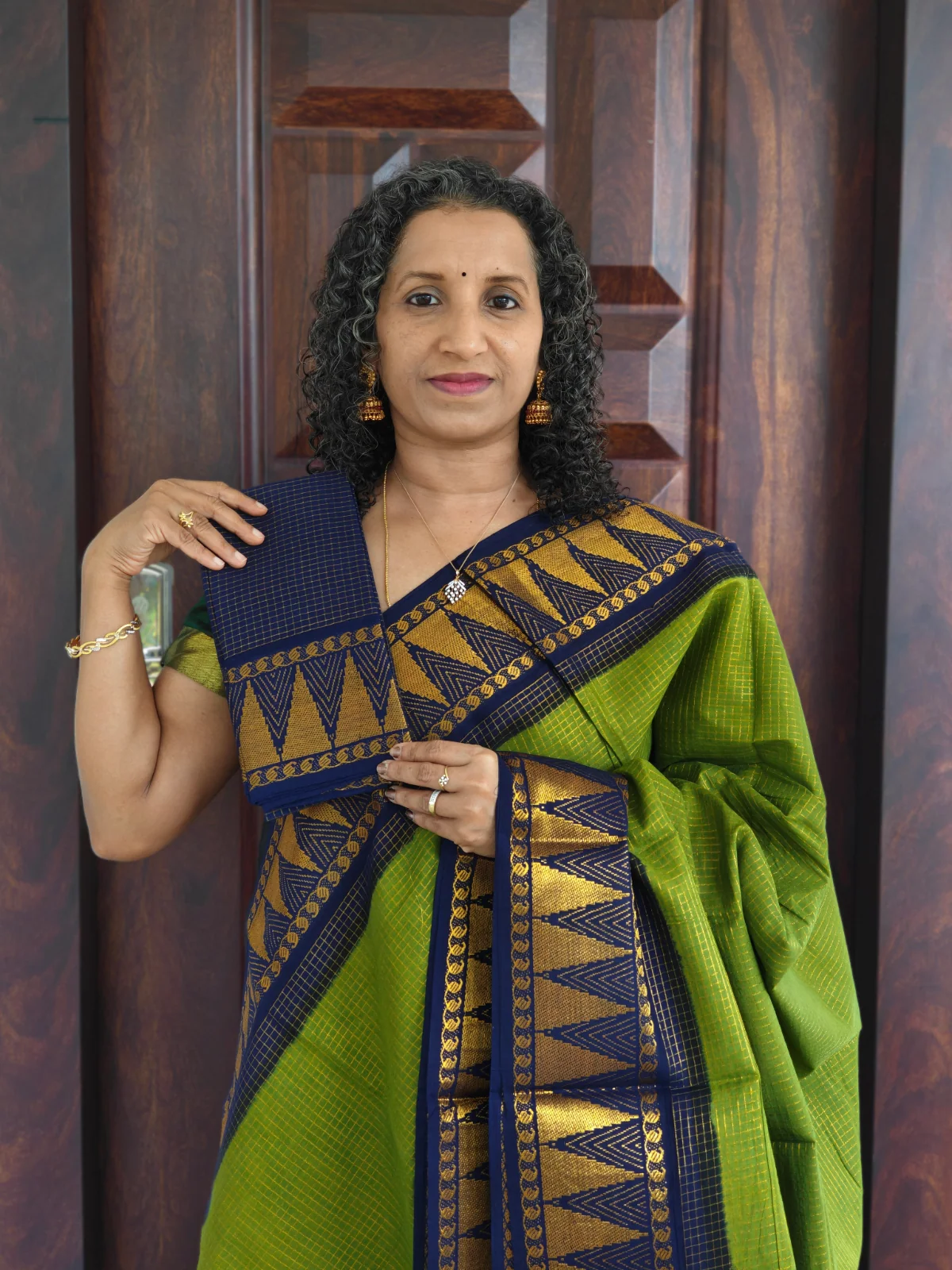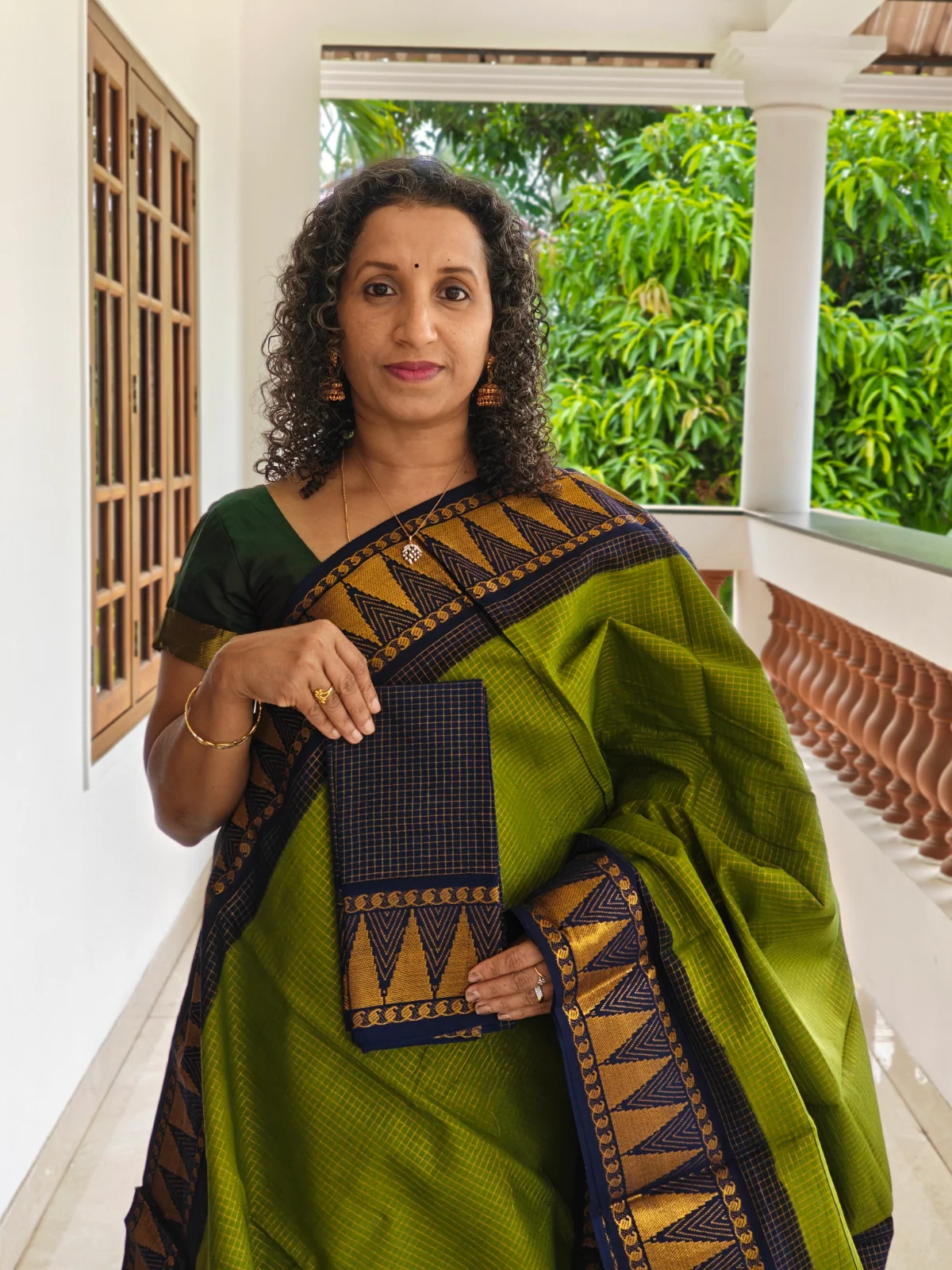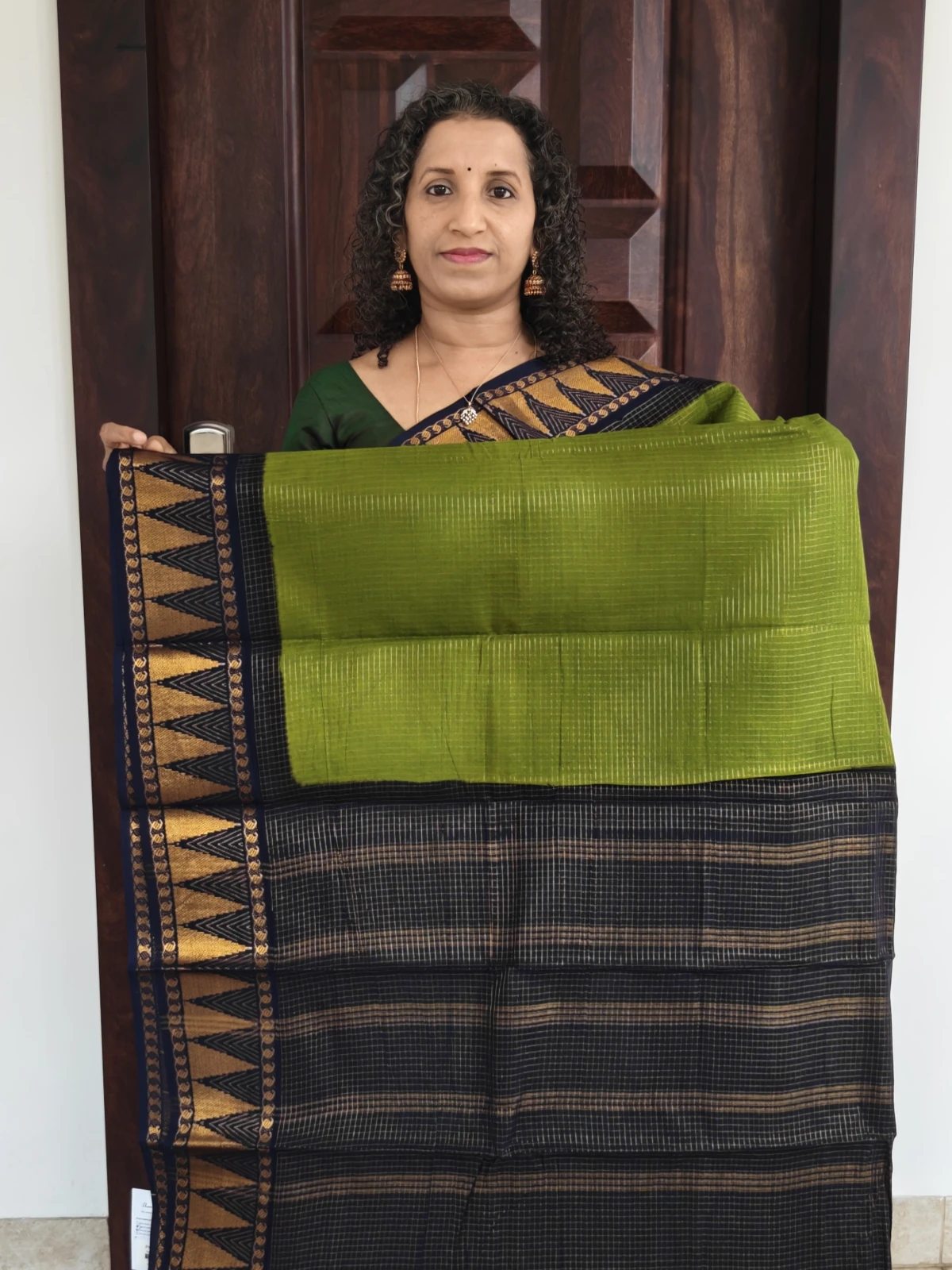 This saree features an olive green base highlighted with a navy blue border with gold triangular motifs creating a sophisticated temple design that adds subtle shine and texture. The saree is complemented with a blue blouse piece woven with classic motifs, giving it a refined ethnic finish.