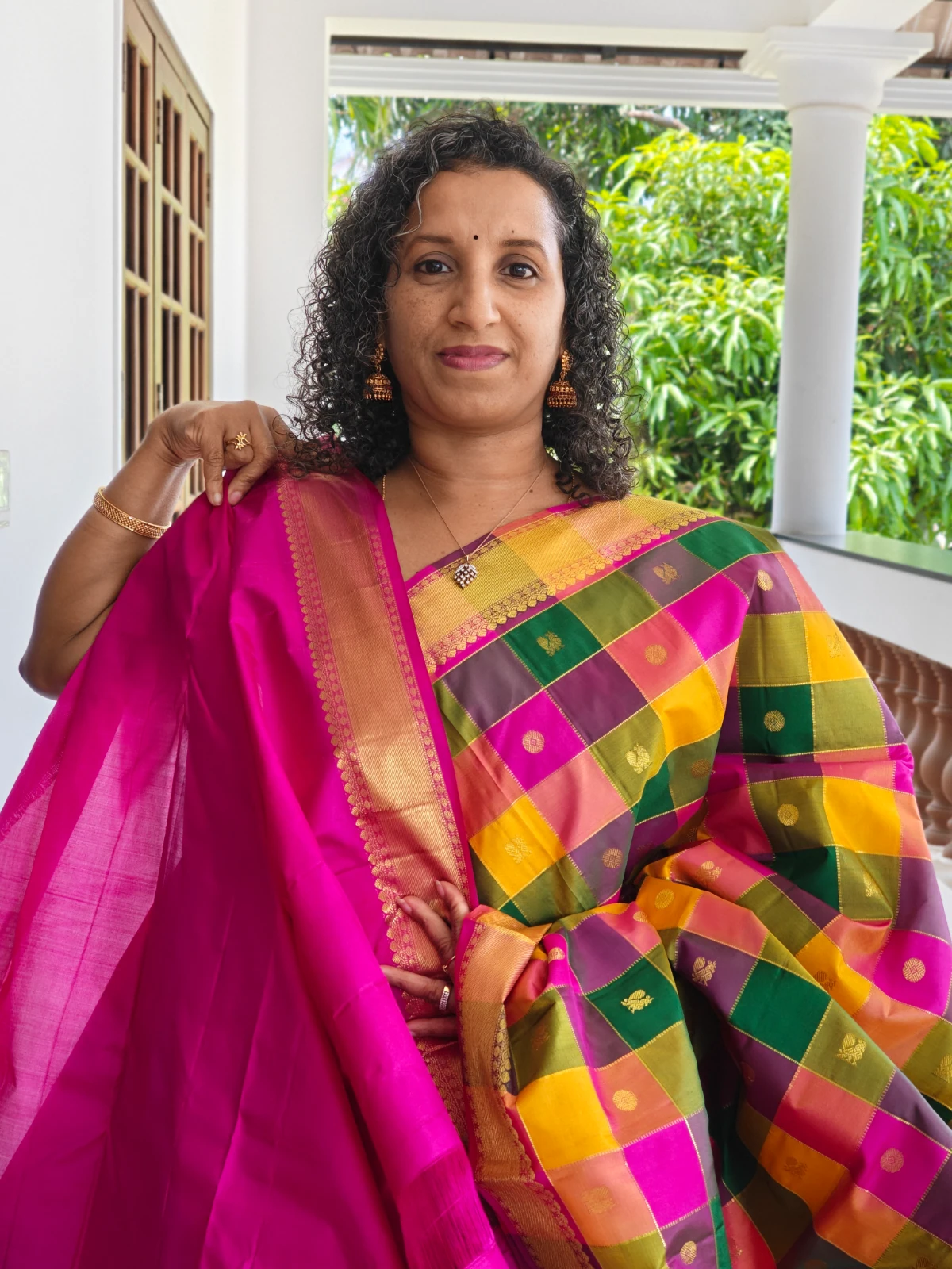 Celebrate timeless South Indian heritage with this traditional Palum Pazhamum checkered design, beautifully woven with a striking combination of green, pink, mustard yellow, and purple silk squares. Each check is highlighted with delicate gold Zari motifs, giving the saree a rich and festive appearance. The saree is finished with a classic Zari border that enhances its traditional South Indian elegance. This pure silk saree is meticulously handwoven using Silk Mark–certified pure silk.