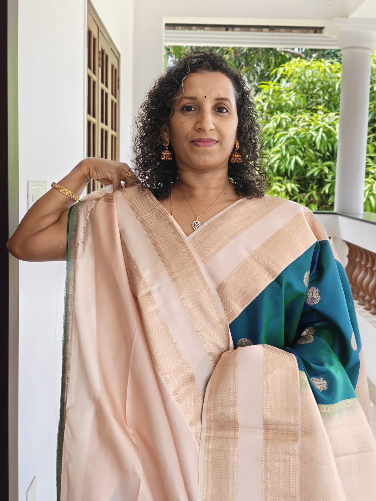 This saree is crafted from pure silk with a certified silk mark. The classic contrast of peacock blue and light pastel pink makes it an ideal choice for weddings, festive celebrations, temple ceremonies, and special occasions.