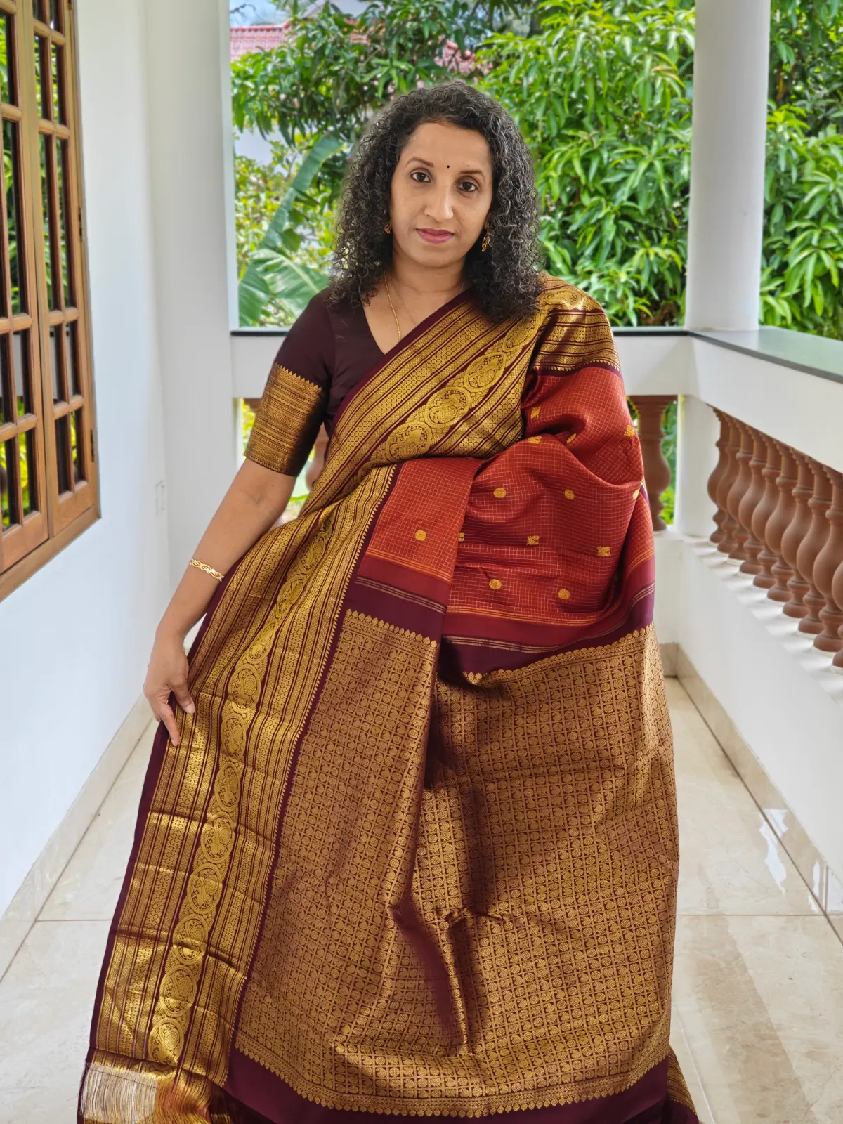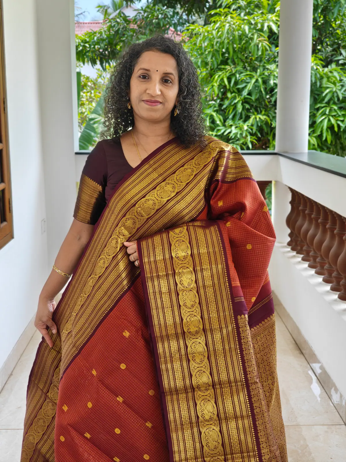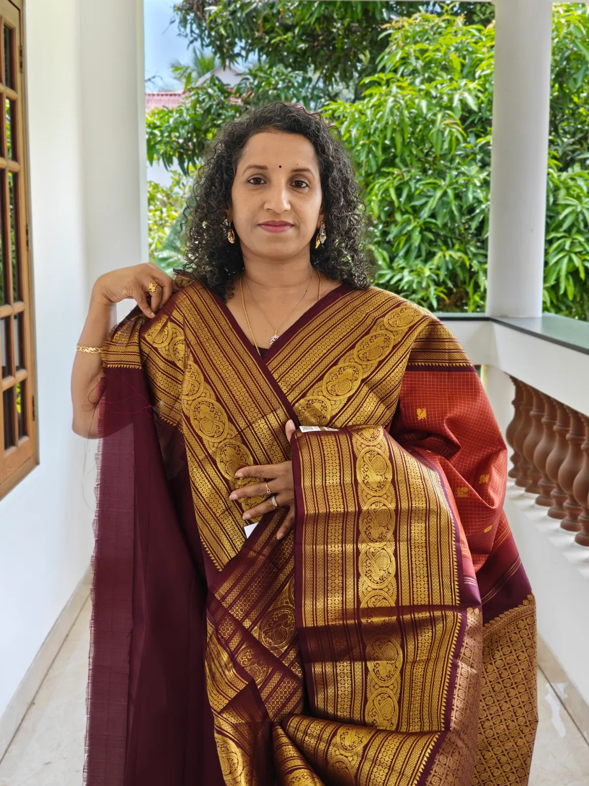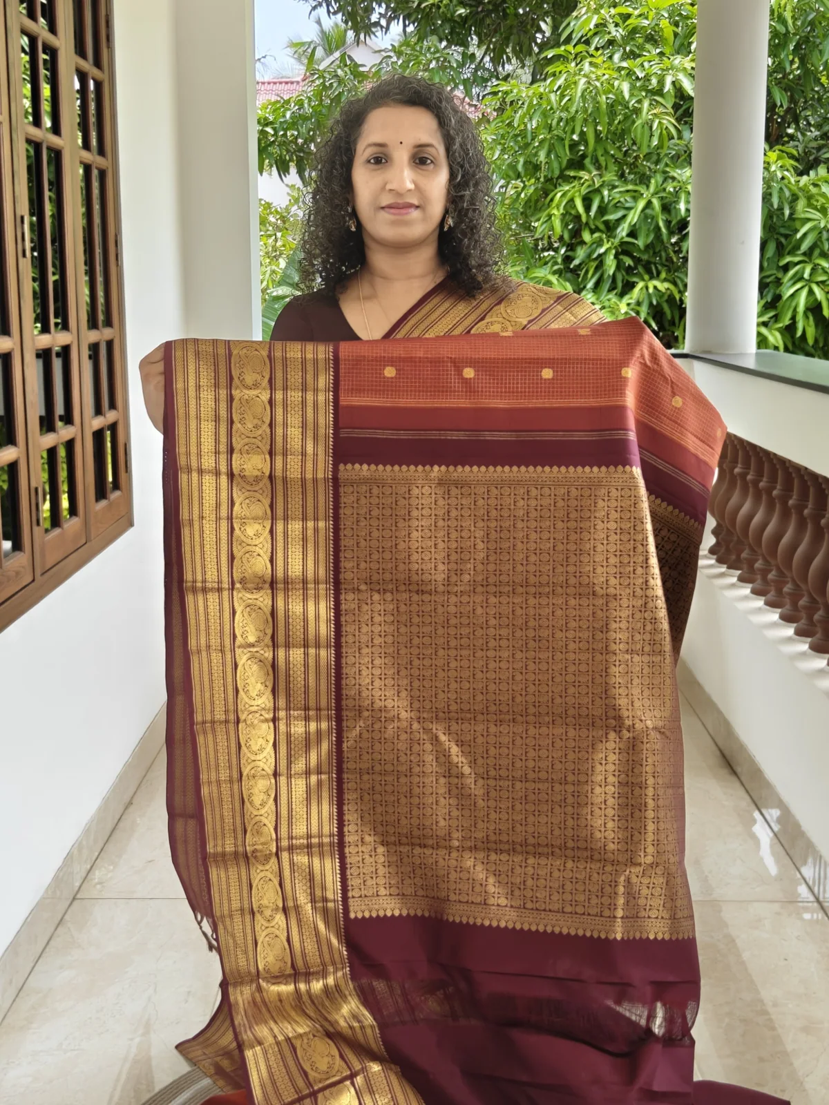 This saree has been crafted from pure silk with a silk mark certification. The classic contrast of rust orange and deep maroon makes it an ideal choice for weddings, festive celebrations, temple ceremonies, and special occasions.