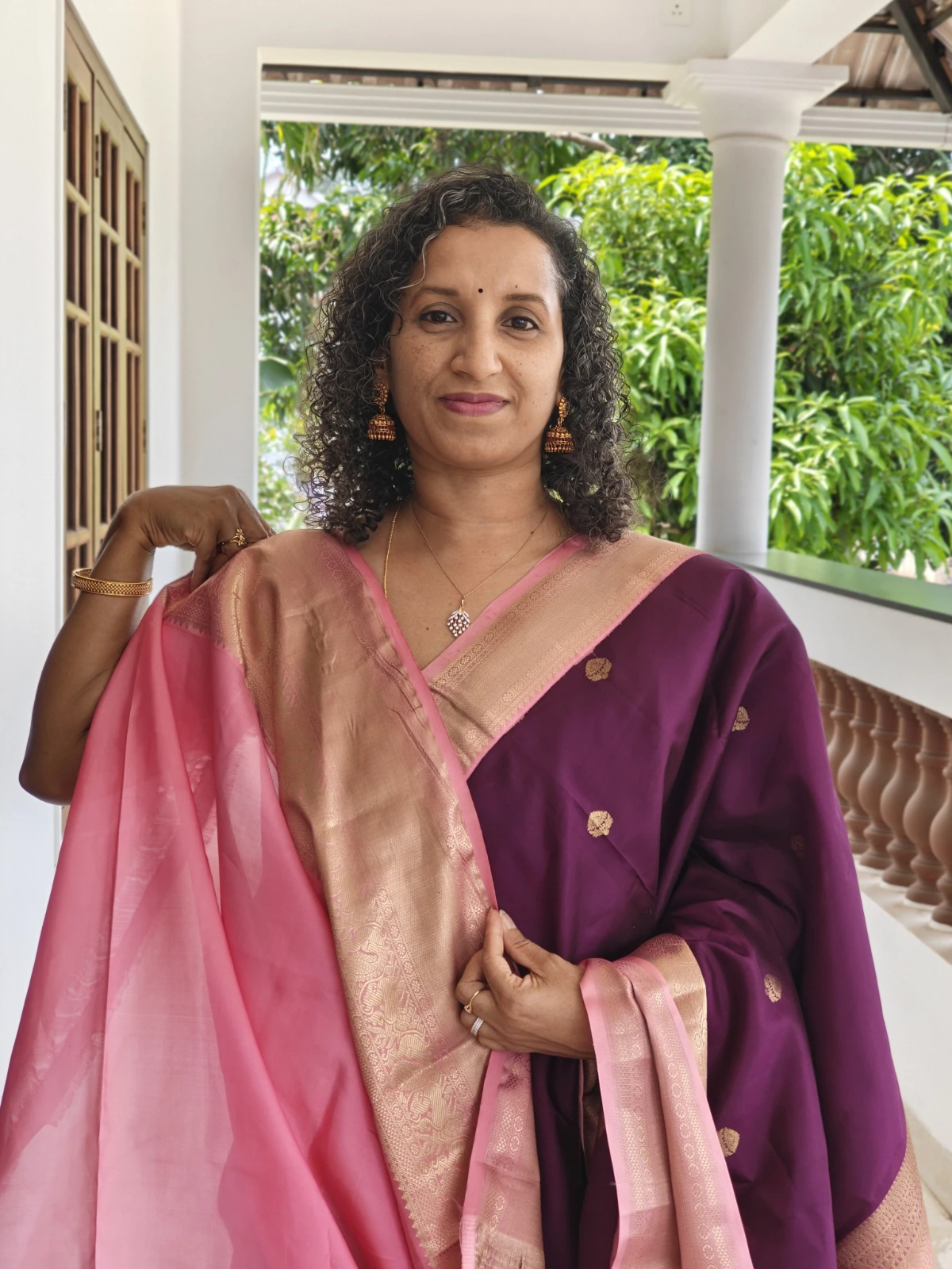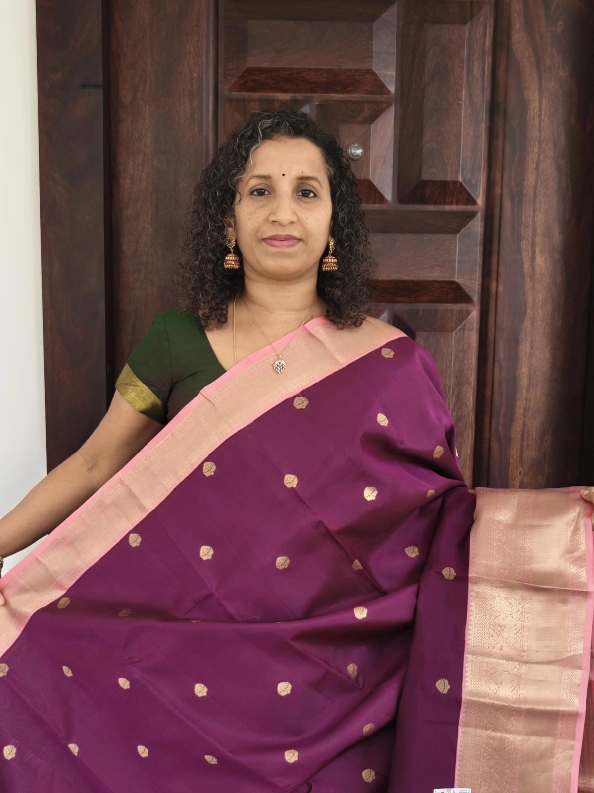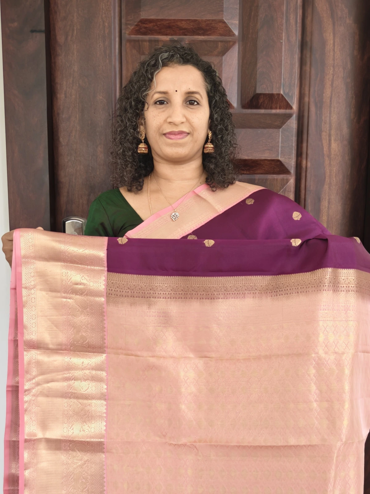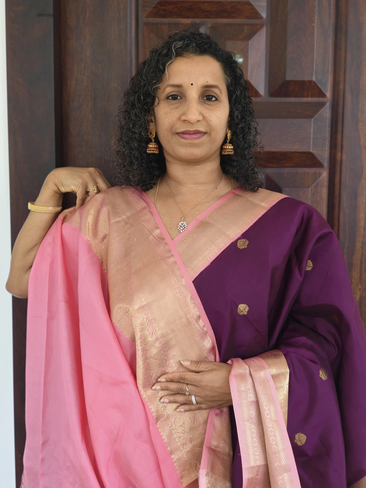This saree is crafted from pure silk with a certified silk mark. The classic contrast of purple and light pink makes it an ideal choice for weddings, festive celebrations, temple ceremonies, and special occasions.