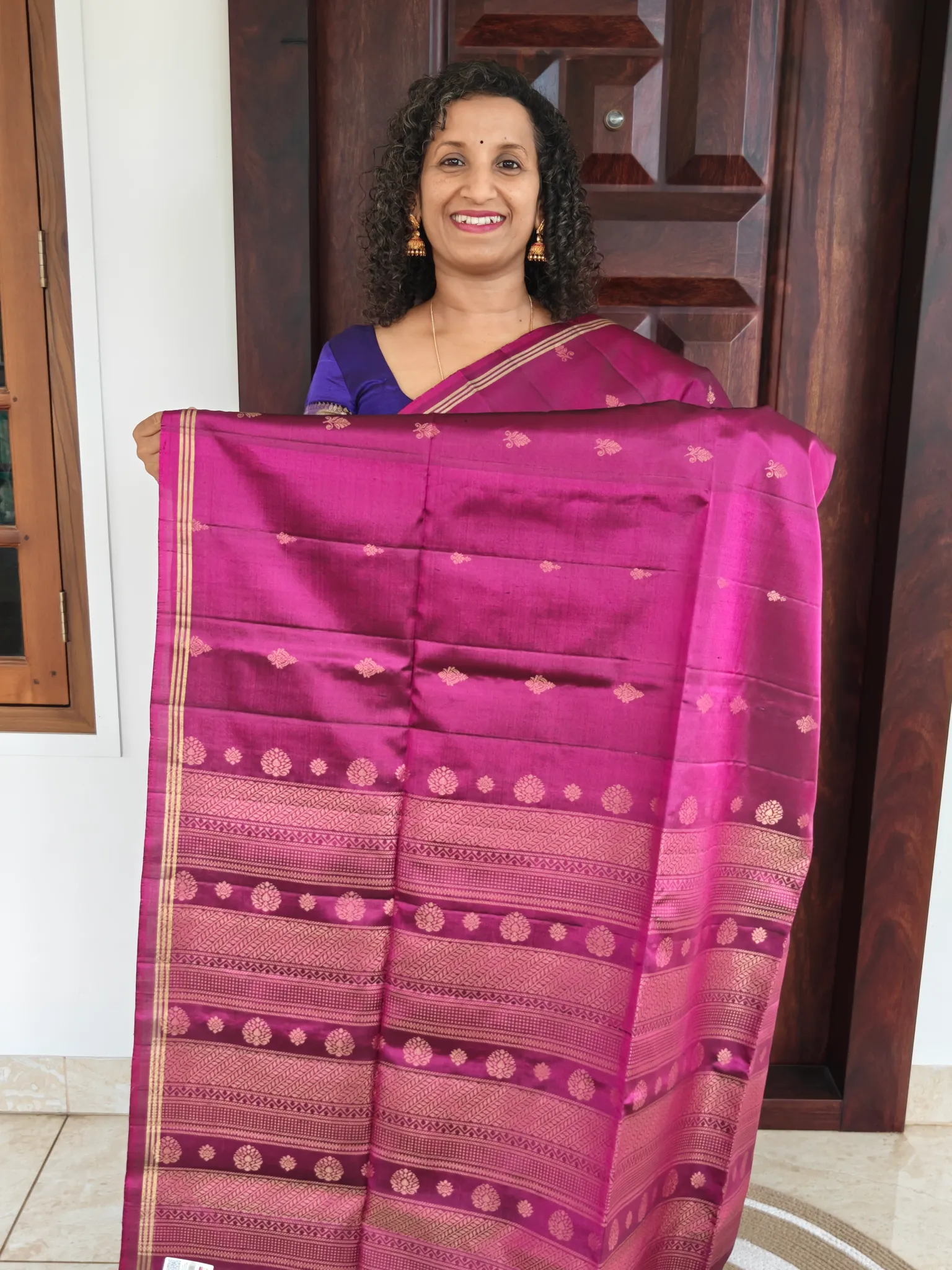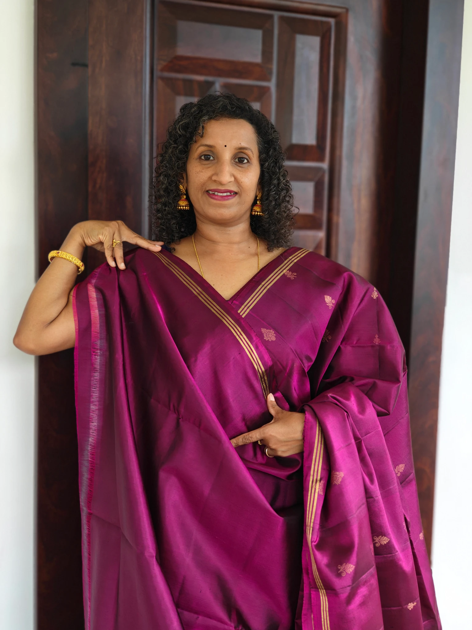 This Purple Kanchipuram Soft Silk Saree, exquisitely woven from Silk Mark-certified pure silk, guarantees authenticity, quality, and long-lasting value. It is the perfect way to celebrate classic South Indian beauty. The deep pink body of the saree is embellished with delicately woven buttis and exquisite golden Zari lines around the borders, which subtly enhance its beautiful appeal.