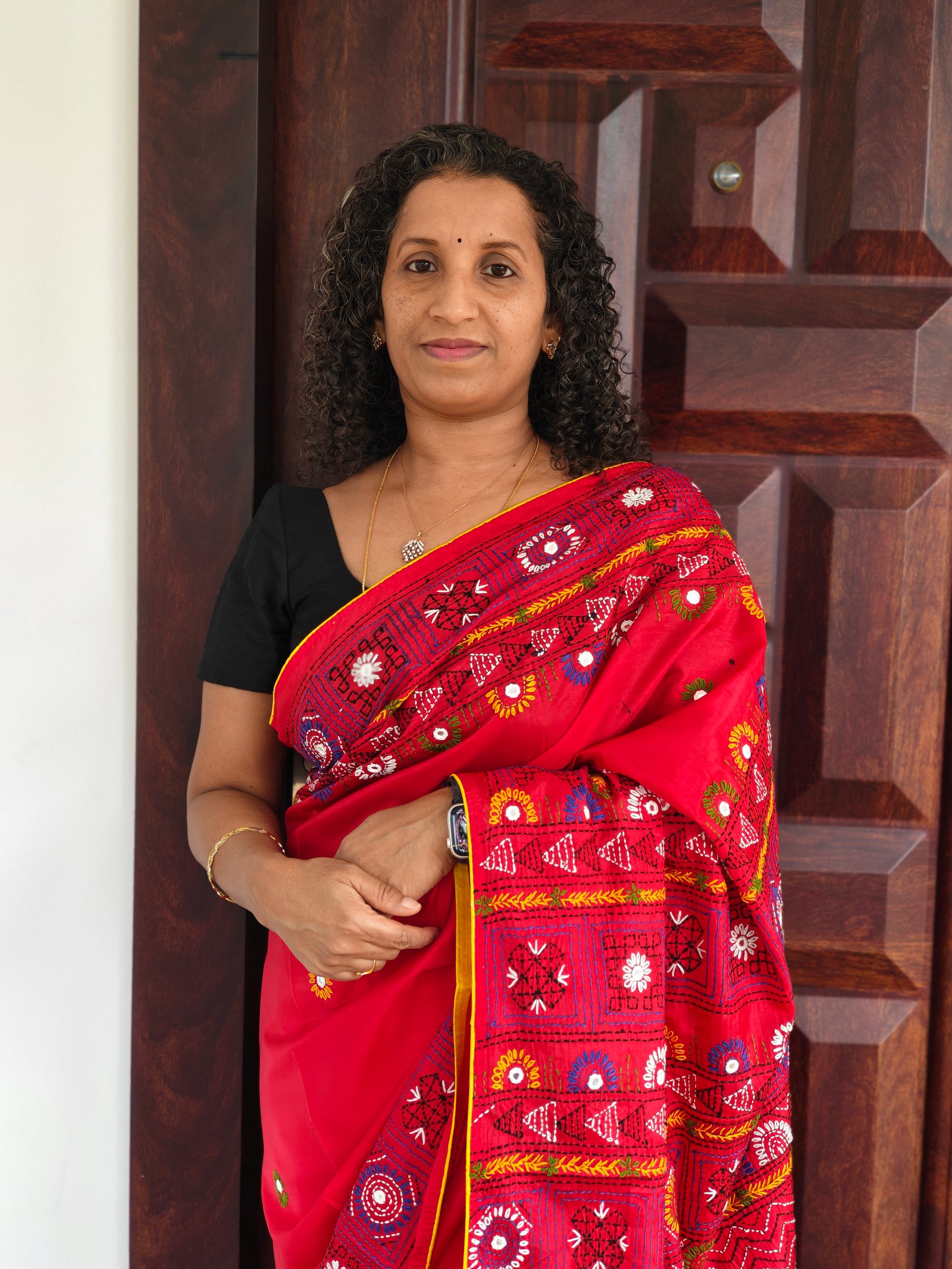 This saree showcases a bright red base enhanced with multicolored embroidered motifs and decorative patterns across the pallu and border, creating a striking and artistic look. The detailed embroidery panels add depth and texture, making the saree visually unique and culturally rich.