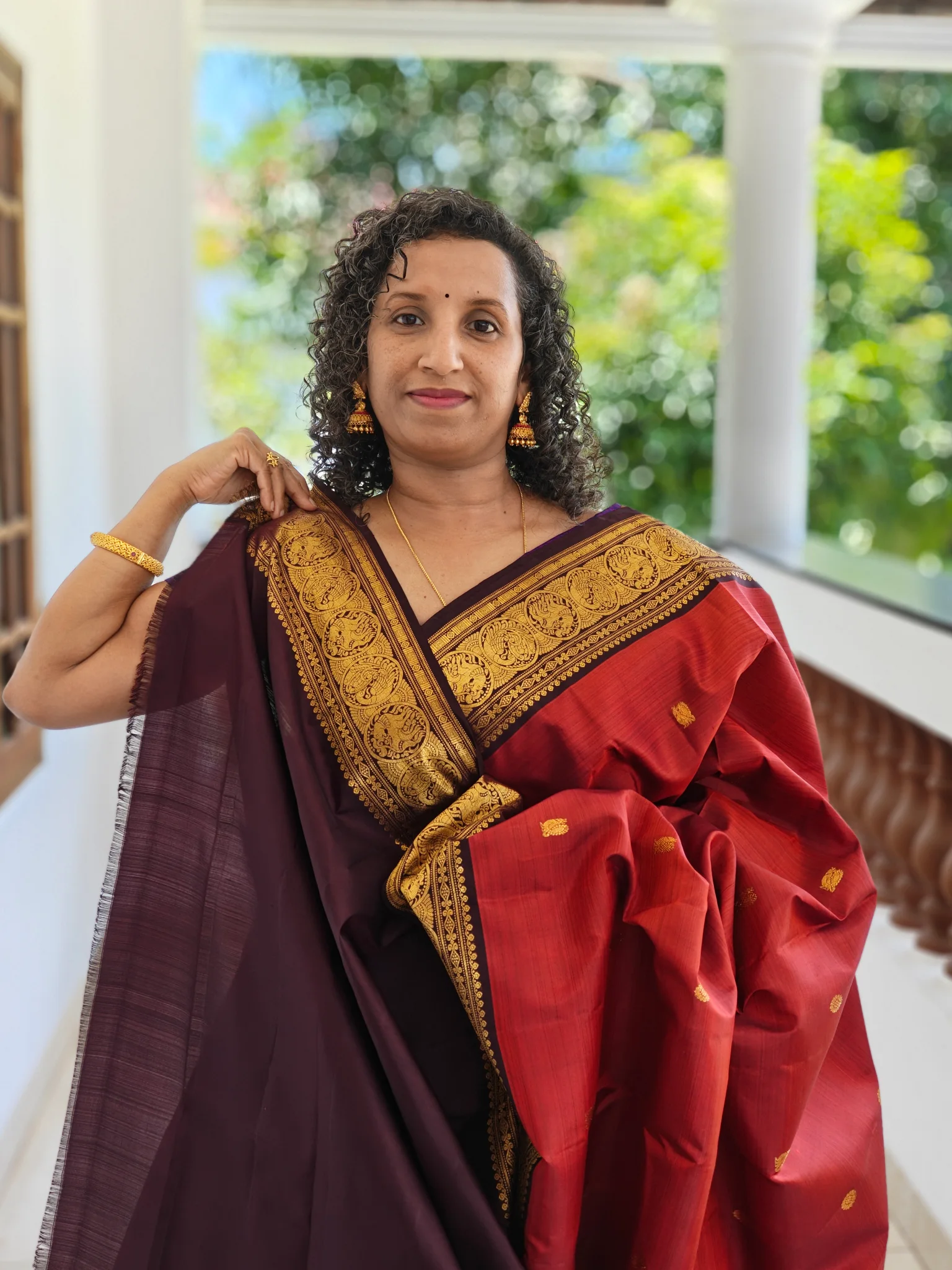 This saree has crafted from pure silk with silk mark certified. The classic contrast of warm reddish orange and deep coffee brown makes it an ideal choice for weddings, festive celebrations, temple ceremonies, and special occasions.